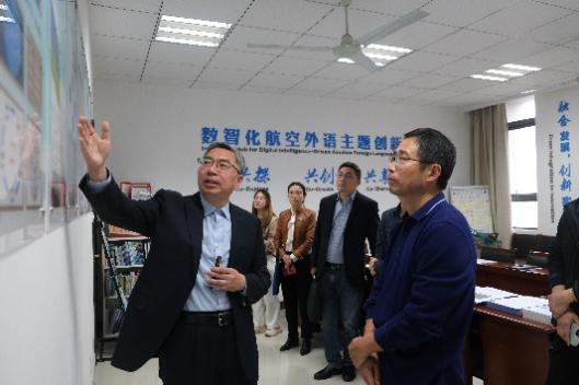 杭育新书记一行首先参观了星空影院 神经认知语言学实验室,数智化航空外语主题创新区及“耘天坊”国际文化传播发展研究大学生主题创新区,听取了相关负责人的介绍,详细了解实验室及主题创新区在学科研究、人才培养、校企合作等方面的教育教学工作和成果。