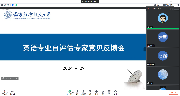 9月29日,星空影院 英语专业自评估专家意见反馈线上会顺利召开。会议由星空影院 副院长徐智鑫主持,评估专家教育部高等学校英语专业教学指导分委员会秘书长、广东外语外贸大学冯光武教授、北京航空航天大学任伟教授、国防科技大学陈春华教授、教师发展与教学评估中心主任朱建军、教务处副处长邓晶出席反馈会,英语专业负责人、全体教师及教学办老师参加会议。