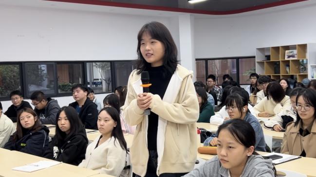 在交流问答环节,同学们踊跃提问、积极发言,陈圣权针对同学们的问题一一进行耐心解答。针对同学提出的最近普遍关心的人工智能翻译快速发展的形势下外语专业学生应如何发展提升自身素质能力的问题,陈先生举出多个案例证明当下人工智能翻译没有人工翻译的延伸能力。面对人工智能时代带来的挑战,同学们需要保持积极的心态,勇于面对挑战;同时,同学们也要善用现代科学技术提高自己的学习效率,不断提升自己的专业技能和综合素质。