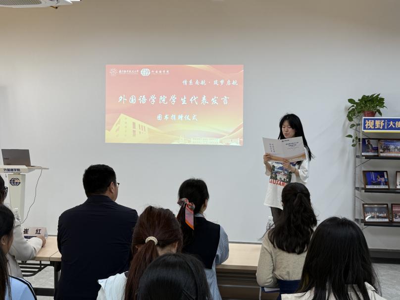 学生代表洪嘉惠结合自身的学习经历,表达了对校区资源与外教社捐赠书籍的感谢。她表示,作为新时代的青年学子,将以书籍为阶梯,不断夯实自己的专业基础,提升跨文化交流能力,以实际行动践行时代赋予的使命和责任。