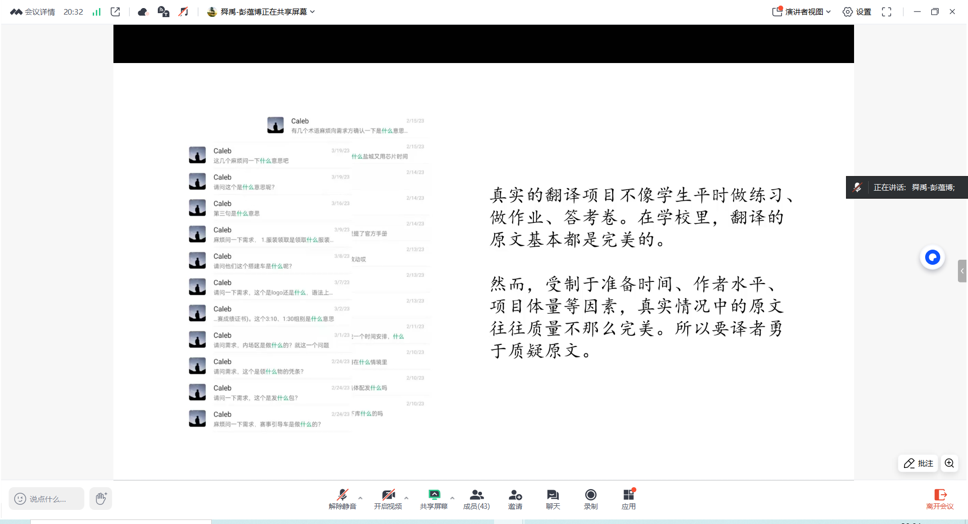 5月19日,彭蕴博经理作了题为“基于公示语翻译项目的MTI学生实践能力培养”的讲座。他揭示了公示语翻译失误的潜在影响,并提出针对性的策略。他特别强调译者需具备“读者意识”与“项目管理者意识”,前者要求译文符合受众文化习惯,后者需全局把控成本与风险。讲座最后,彭蕴博认为作为重要的语言服务实践行为,公示语翻译需达到“润物无声”的效果。