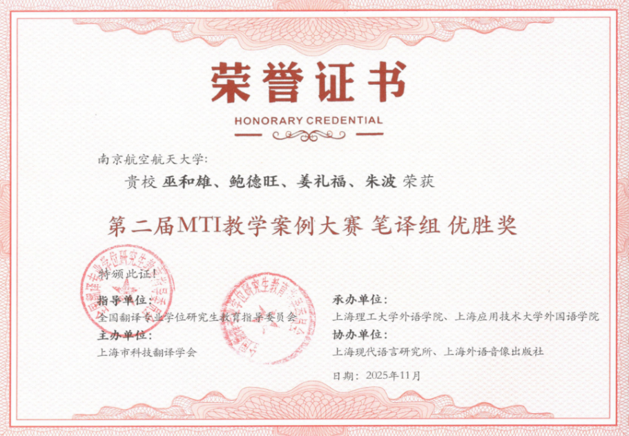 MTI教指委发布大赛信息以来,学院领导高度重视,鼓励老师们组建翻译团队,积极参加比赛,达到“以赛促教,提高教学质量”的目的。通过努力,星空影院 鲍德旺老师团队的《逐梦九天再出征:航天新闻报道英译》教学案例、巫和雄老师团队的《<丢掉幻想,准备斗争>英译赏析与实践》教学案例分获此次大赛笔译组三等奖与优秀奖。学院也将以此次大赛为契机,支持MTI导师参加明年举办的案例大赛,努力提升MTI研究生的翻译实践能力,提高MTI研究生培养质量,为国家培养更多合格的具有“三航”特色的翻译人才。